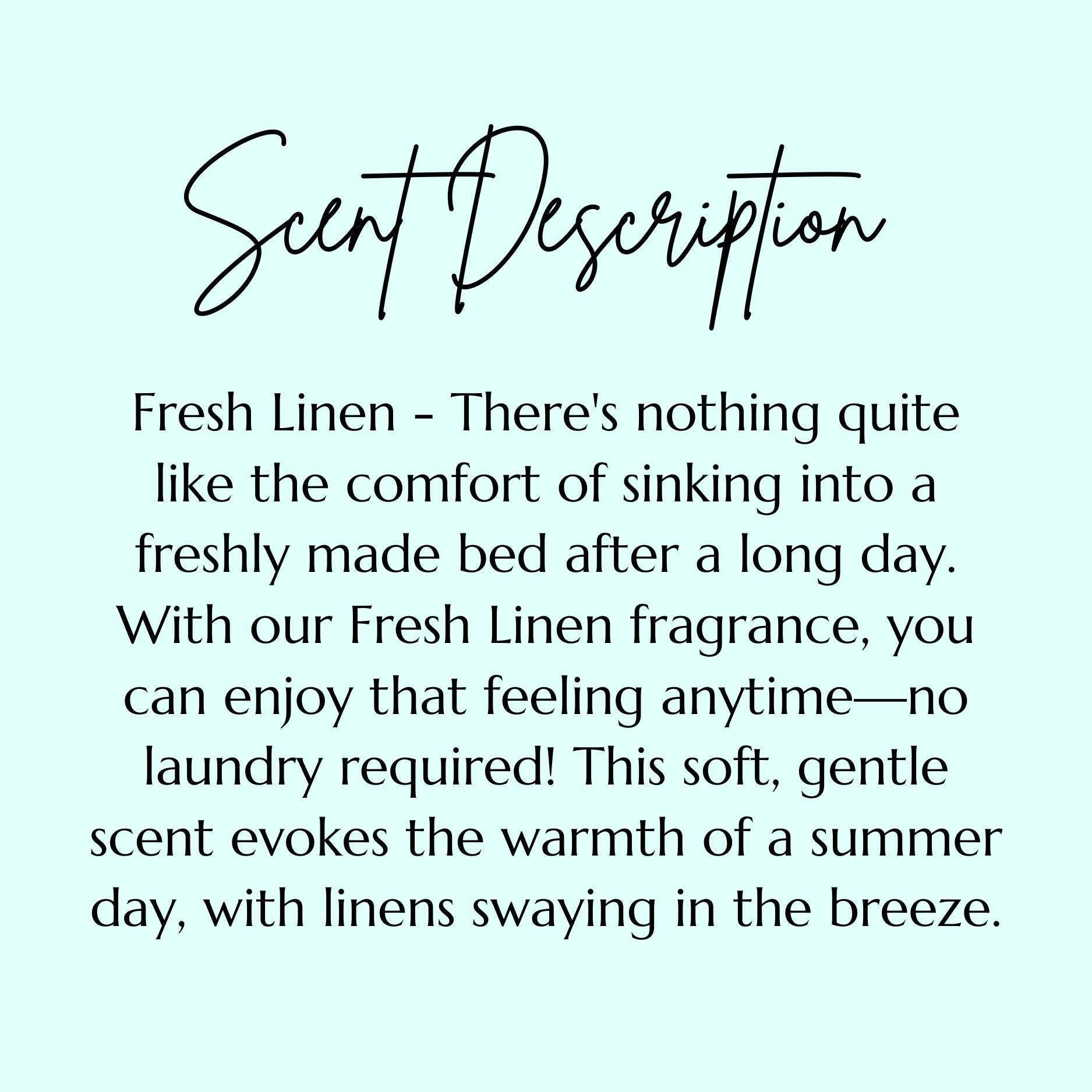 Fresh Linen - There's nothing quite like the comfort of sinking into a freshly made bed after a long day. With our Fresh Linen fragrance, you can enjoy that feeling anytime—no laundry required! This soft, gentle scent evokes the warmth of a summer day, with linens swaying in the breeze.