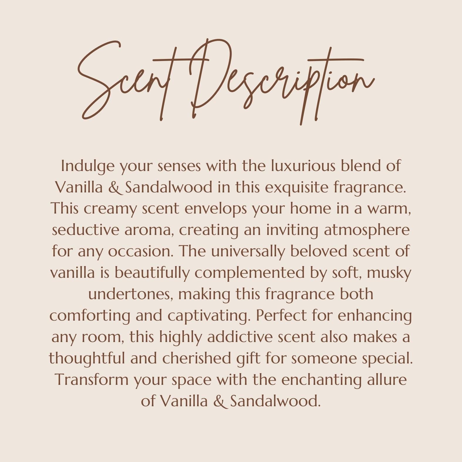 Scent: Indulge your senses with the luxurious blend of Vanilla & Sandalwood in this exquisite fragrance. This creamy scent envelops your home in a warm, seductive aroma, creating an inviting atmosphere for any occasion. The universally beloved scent of vanilla is beautifully complemented by soft, musky undertones, making this fragrance both comforting and captivating. Perfect for enhancing any room, this highly addictive scent also makes a thoughtful and cherished gift for someone special. Transform your space with the enchanting allure of Vanilla & Sandalwood.